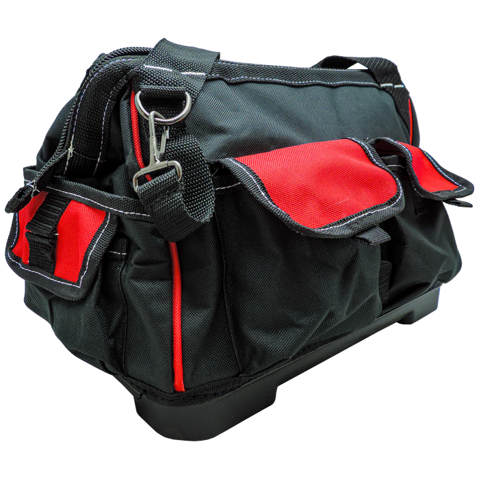 Engineered with durable 600D polyester, this tool bag is able to withstand the rigours of demanding job sites. Inside, you'll find 10 spacious pockets surrounding the central compartment, offering organised storage for a variety of tools. Additionally, the bag features eight exterior compartments, including four with secure Velcro flaps, perfect for keeping smaller items easily accessible and well-protected. For added versatility, the bag is equipped with various clips and sewn-in hooks, ideal for securing building plans, levels, or other essential accessories.
