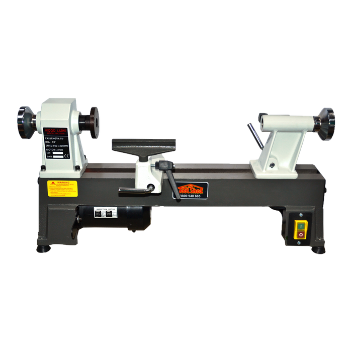 The ToolShed Midi Wood Working Lathe is manufactured from a cast iron bed, head, and tail stock. Powered by a copper wound 370W (1/2hp) motor, this lathe features five belt driven speeds ranging from 760RPM to 3200RPM. It will lock securely in place to keep your material nice and centred while you work. This lathe is 400mm between centres and has a 240mm swing. It is also supplied with a live centre, spur centre on a morse taper 2, and an 80mm faceplate. Also supplied is an adjustable cast iron tool rest that adjusts up and down, can be angled, and can be positioned up or down the bed.