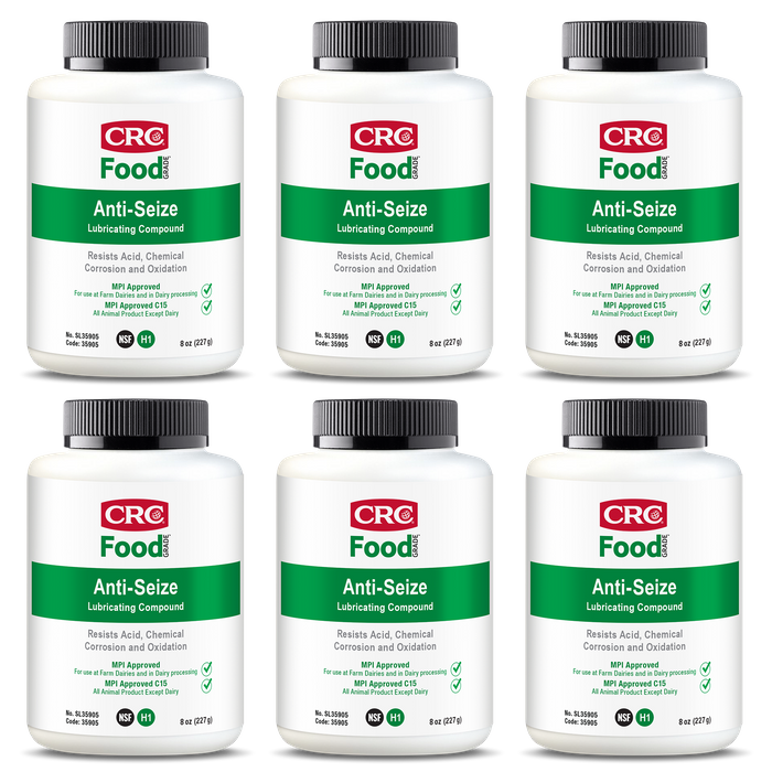 CRC Food Grade Anti-Seize & Lubricating Compound is a premium anti-seize compound with PTFE, specifically formulated for use in applications where incidental food contact is possible. It tenaciously adheres to metal surfaces providing protection from destructive metal to metal contact on sliding or rotational contact surfaces.It prevents seizure, galling and heat freeze on all types of engines during the installation and assembly of parts and facilitates fast and easy disassembly. It remains active over long storage periods preventing rust and corrosion and supporting cushioning of close fitting parts. Continued use prevents damage caused by extreme conditions, increasing performance and prolonging equipment life.Extreme temperature range from -53°C to +980°C. MPI approved for use at Farm Dairies and in Dairy processing. MPI Approved C15, all Animal Product Except Dairy. NSF H1 Registered. Conforms to MIL-PRF-907E.