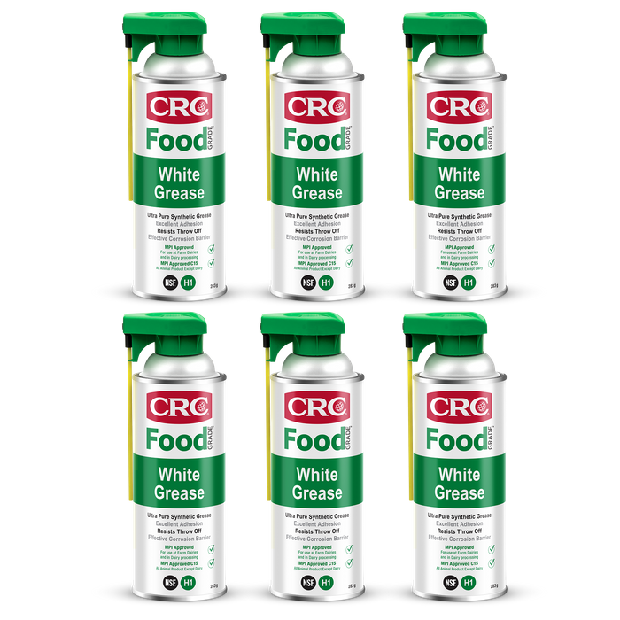 CRC Food Grade White Grease is a high purity, high quality synthetic grease, with an advanced additive package that provides superior lubrication, durability, corrosion protection, film strength, and excellent water and heat resistance. Convenient aerosol application allows for lubricating hard-to-reach areas.This versatile grease is designed for high load applications requiring a long grease life and is ideal for heavy-duty metal-to-metal lubrication.Wide Temperature Range from -17°C to +230°C. MPI approved for use at Farm Dairies and in Dairy processing. MPI Approved C15, all Animal Product Except Dairy. NSF H1 Registered.