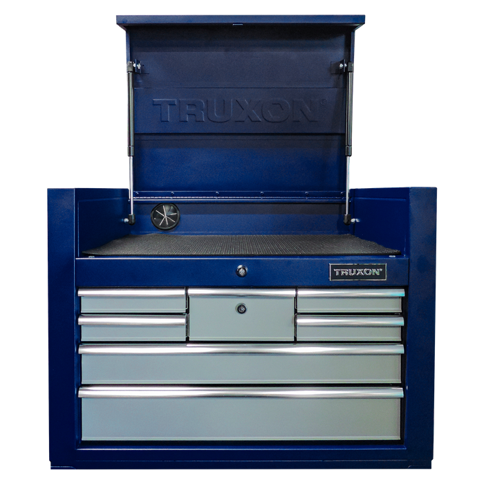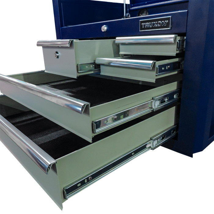 Equipped with ergonomic heavy-duty handles on both sides, this chest is easy to transport, making it ideal for versatile work environments. A rear panel cable grommet adds convenience for managing power tool cords or charging equipment. With a thoughtfully designed layout that includes a spacious top compartment, four small drawers, and two long drawers, the TRUXON® Tool Chest is engineered for professionals who settle for nothing less than the best.
