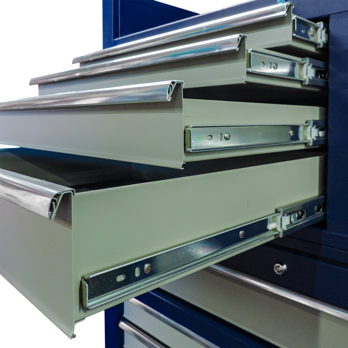 Crafted from heavy-duty steel with a durable powder-coated finish, this premium chest ensures exceptional strength and lasting performance. Its innovative design features self-closing drawers with secure latch mechanisms for smooth, reliable operation, complemented by hydraulic gas struts for effortless access to the spacious top working compartment.