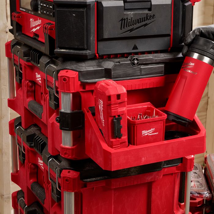 Milwaukee's PACKOUT™ Tool Box Tray Attachment delivers quick access to tools and materials while on the jobsite. Fully customise your tool box with the ability to mount your accessory cases, bins, and more to the outside of your stack. The impact-resistant body offers maximum durability and can withstand tough jobsite conditions.