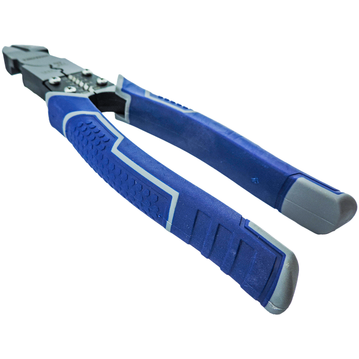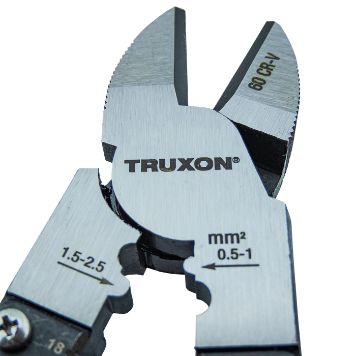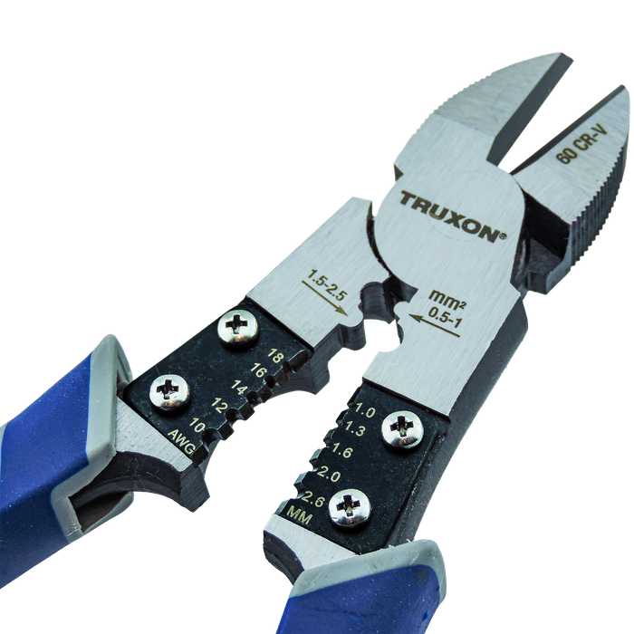 The TRUXON® 210mm multi-function 200mm high leverage stripping and crimping pliers have been designed from the ground up with the tradesperson, functionality and durability in mind. It features an offset fulcrum providing high leverage requiring 35% less force from the user. Forged from #60 Cr-V the cutting head is a knife-on-knife system that cuts all the way to the tip and has been heat treated. For additional versatility, the head also features a pipe reamer/deburrer for 12mm to 25mm pipes.