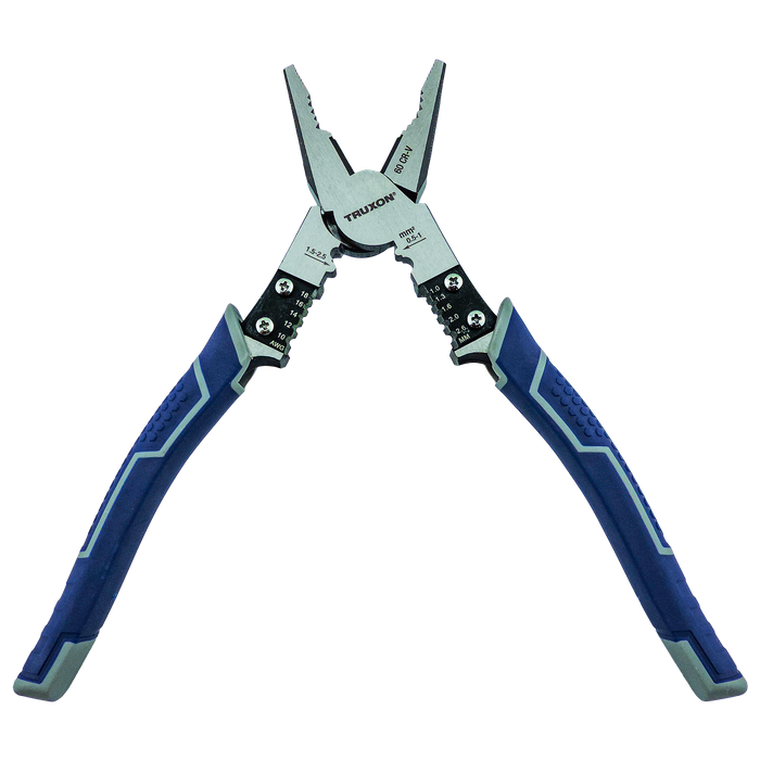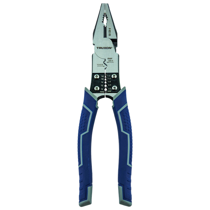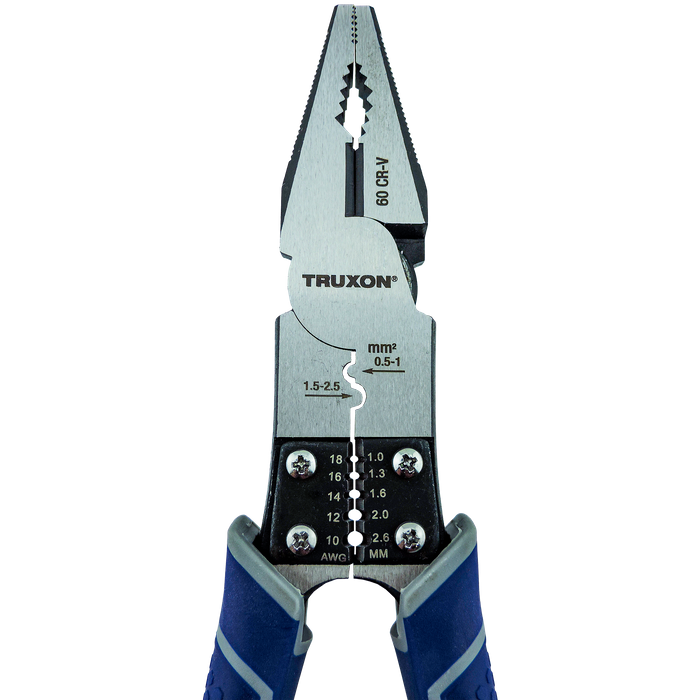 The TRUXON® 215mm Combination Pliers offer high leverage cutting, crimping, stripping, and reaming, all in one tool. Forged from #60 Cr-V steel, they feature heat-treated cutting jaws with a hardness up to 63 HRC and an offset pivot point that reduces user effort by 35 percent. The dual-size crimper handles up to 2.5mm sleeves, while the adjustable wire stripper accommodates sizes from 1.0 to 2.6mm. Offset teeth improve grip and minimise slippage, and the deburring head suits pipes from 10 to 24 millimetres. Slim, ergonomic handles provide a secure and anti-fatigue grip for the user.
