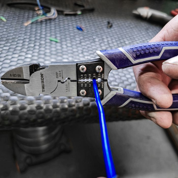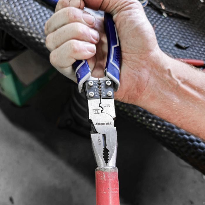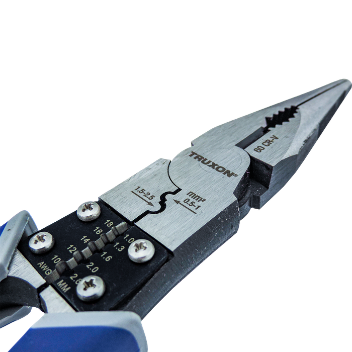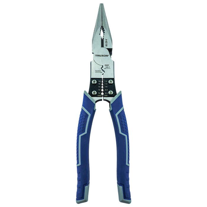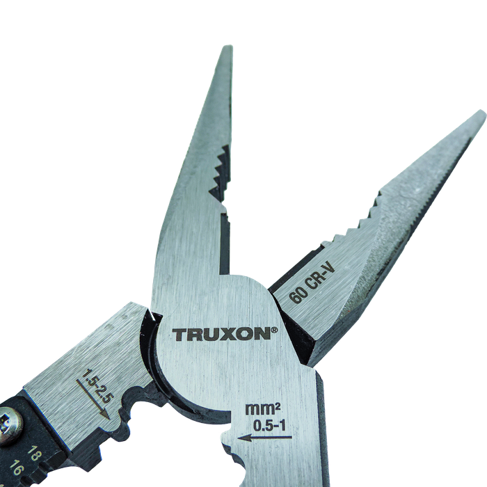 The TRUXON® 230mm High Leverage Long Nose Pliers offer precise gripping, cutting, crimping, and stripping in one tool. Forged from #60 Cr-V steel, they feature heat-treated cutting jaws and gripping teeth with a hardness of 58 to 63 HRC. The offset pivot point provides high leverage, reducing effort by 35%. The dual-size crimper supports up to 2.5mm sleeves, while the adjustable wire stripper accommodates sizes from 1.0 to 2.6mm. Offset teeth enhance grip and reduce slippage, and the deburring head fits pipes up to 19mm. Slim, ergonomic handles ensure an anti-fatigue and secure grip.