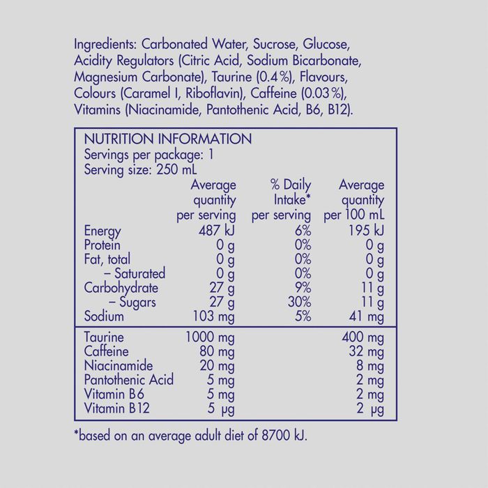 Carbonated Water, Sucrose, Glucose, Acidity Regulator (Citric Acid, Sodium Bicarbonate, Magnesium Carbonate), Taurine (0.4%), Flavours, Colours (Caramel I, Riboflavin), Caffeine (0.03%), Vitamins (Niacinamide, Pantothenic Acid, B6, B12)