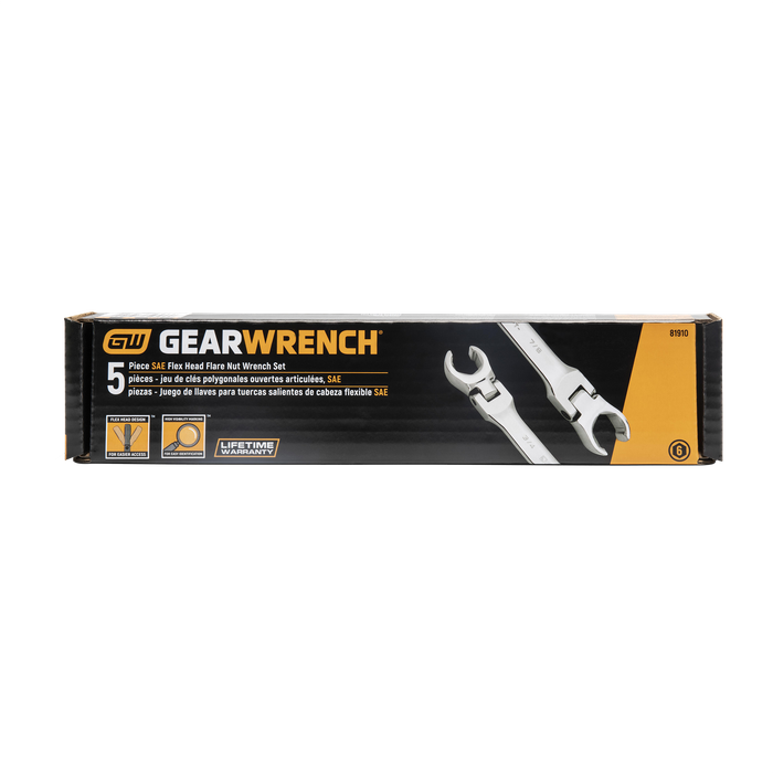 GEARWRENCH family of flare nut wrenches are a great addition to the toolbox of anyone that needs to loosen and tighten hex nuts. They are available in ratcheting flex head, flex head, and standard pattern bodies. All wrenches have 2 sizes on each wrench, saving space in your tool box. They are manufactured from durable alloy steel and all feature a bright, full polish chrome finish. Ideal for use on hex nuts where tubes are present, such as a vehicle's fuel and brake lines.