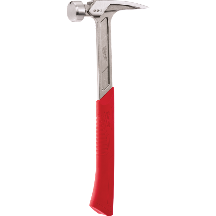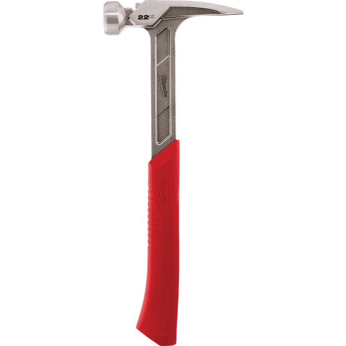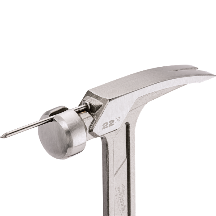 The Milwaukee® 22oz Smooth Face Framing Hammer is designed from the ground-up to address common user frustrations with hammers currently available on the market, providing superior driving performance and reduced peak vibration. Constructed with a steel I-Beam Handle, the new hammer is designed to withstand the harshest jobsite use and a SHOCKSHIELD™ grip provides superior durability and vibration reduction. For added user benefit, the hammer features an anti-ring claw design which reduces noise and ringing when striking hardened objects, and a magnetic nail set to allow one handed nail setting.