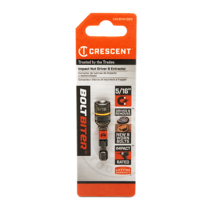 The new Crescent Bolt Biter (TM) impact nut driver & extractors feature an innovative hex head design that grips any nut or bolt, no matter how damaged. The revolutionary bi-directional design is suitable for driving and removing hex head fasteners of any condition (new, worn, rounded, rusted, damaged)