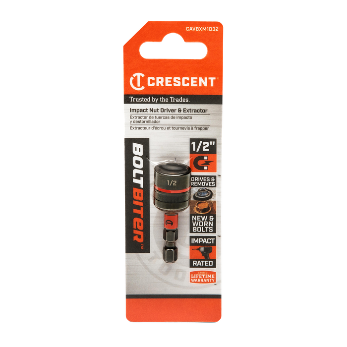 The new Crescent Bolt Biter (TM) impact nut driver & extractors feature an innovative hex head design that grips any nut or bolt, no matter how damaged. The revolutionary bi-directional design is suitable for driving and removing hex head fasteners of any condition (new, worn, rounded, rusted, damaged)