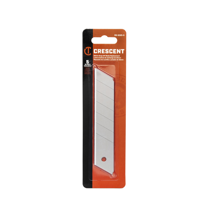 Crescent's 5-pack of 25mm snap off blades are designed for best performance and durability when cutting most jobsite materials. Each blade features 7 points to allow for consistent cuts throughout the blade's lifespan. Crescent's 25mm snap blades are engineered to fit the Crescent 25mm snap knife as well as most standard 25mm snap knives.