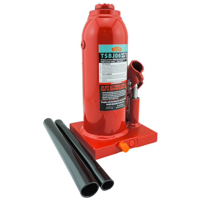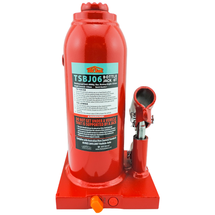 Built tough for lifting heavy loads safely and efficiently, the ToolShed 6 Tonne Bottle Jack is an essential addition to any workshop, garage, or on-site repairs. Fully compliant with AS/NZS 2693:2007 standards for vehicle jacks, and with a lifting range from 230mm to 455mm, it offers excellent clearance for a wide variety of vehicles and machinery. The serrated saddle ensures a secure grip on the load, while the wide base plate enhances overall stability during use. A three-piece, collapsible handle measuring 390mm provides comfortable operation and easy storage. Designed with a safety valve to prevent overloading, this jack is ideal for professional mechanics, serious DIYers, and farmers.