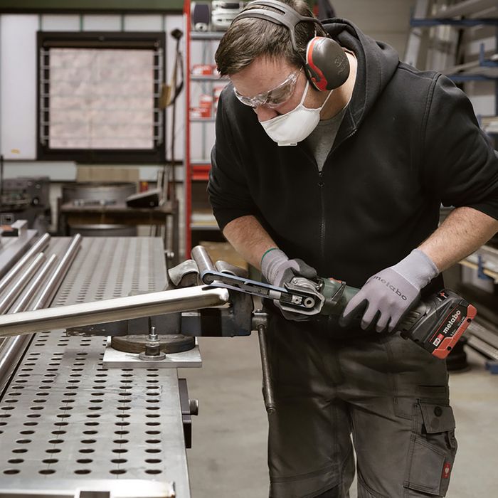 - Powerful, compact cordless band file for grinding, burnishing and deburring in places difficult to reach