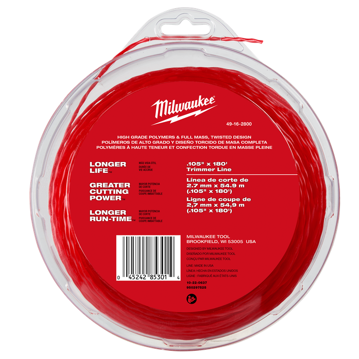 Milwaukee's 2.7 mm x 55 m Trimmer Line utilises high grade polymers and a full mass, twisted design to provide long life,