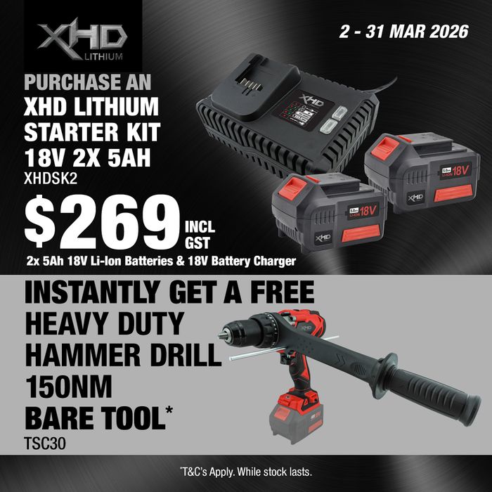 - XHD Lithium Starter Kit 18V 2x 5Ah with Heavy Duty Hammer Drill Brushless 150Nm