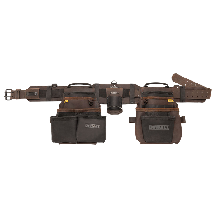 Access your tools, accessories, hardware, and more with the DEWALT® Leather Tool Rig. Designed to withstand harsh jobsite conditions, this top-of-the-line storage solution keeps everyday essentials organized and at-the-ready with 18 pockets of varying sizes. Lightweight and portable with a sturdy carry handle, this premium leather pouch provides plenty of room for your necessities.