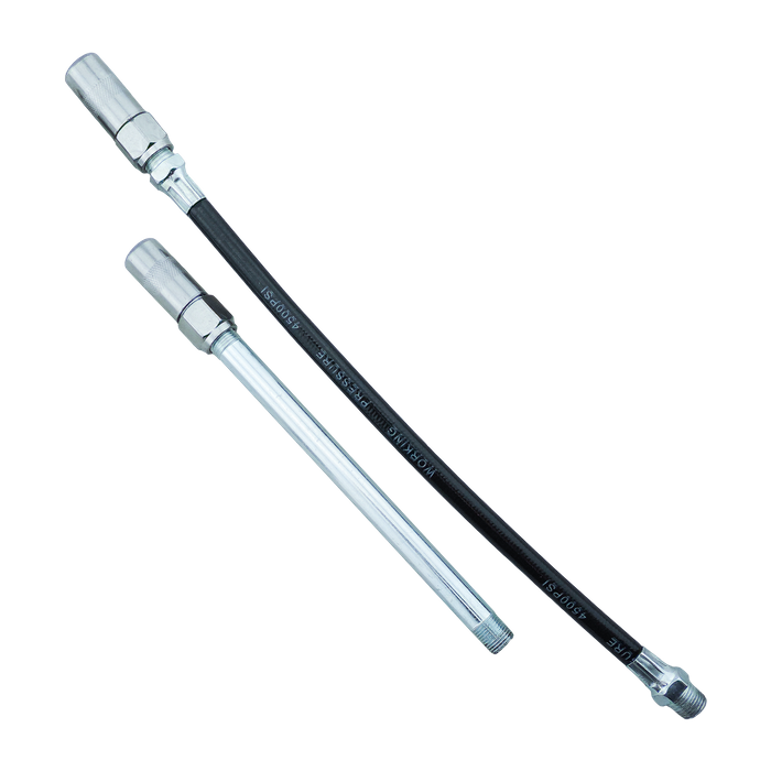 Designed with a durable powder-coated metal body, this robust unit delivers up to 4500 PSI (310 Bar) of pressure, making it ideal for heavy-duty greasing tasks. It features a fast-action pistol grip lever with a soft rubber handle, allowing for smooth, one-handed operation without fatigue. For added versatility, it includes both a 140mm steel extension with coupler and a 250mm flexible hose with coupler, interchangeable between multiple outlets, giving you access to hard-to-reach fittings. The knurled barrel ensures a firm grip during use and easy refilling, while the four-jaw couplers offer secure, leak-free connections. Compatible with 450g grease cartridges, this can be bulk loaded, suction filled, or hand filled.
