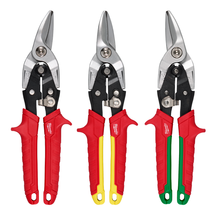 3PC Aviation Snip Set is built for long life and clean cuts. Forged blades with laser-hardened edges are durable and deliver long life. Sharp, serrated blades provide smooth and clean cuts. Our handles are designed to deliver easy, low-effort cutting. Bolt locking mechanism ensures the blades won't loosen and chrome plating provides rust protection. The color-coded handles allow for easy identification on the job. The metal lock secures the tool for storage and is easily operated with one hand. The 3 PC Aviation Snip Set includes Left, Right, and Straight Aviation Snips.