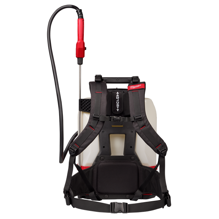 capability to complete a wide range of applications. Paired with an M18™ REDLITHIUM™ 5.0Ah Battery (sold separately), the Sprayer can discharge 40 tanks of spraying per charge (on Mode 3). The 15 Litre Chemical Sprayer Tank Assembly features a dual diaphragm pump for long pump life and Viton® seals for durability against harsh chemicals. The Sprayer Tank has an optimised design with improved weight distribution, a wide mouth opening for easy pouring, measuring cup, and a strainer that filters debris from getting into the tank. The Backpack Powered Base includes padded straps, lumbar support, and a hip belt, providing comfort during extended spraying applications. The 15 Litre Chemical Sprayer is made up of two components, the M18™ SWITCH TANK™ Powered Base and the 15 Litre Chemical Sprayer Tank Assembly (also available separately as 491619PS). The Powered Base includes the motor, battery compartment, and REDLINK™ electronics, while the interchangeable Tank Assembly includes the pump, hose, and wand. This isolated pump, hose, and wand design allows users to add on tank assemblies for different spraying applications, eliminating cross-chemical contamination. The Powered Base is also compatible with the 15 Litre Water Supply Tank Assembly (491619WS).