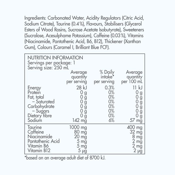 Carbonated Water, Acidity Regulator (Citric Acid, Sodium Bicarbonate, Magnesium Carbonate), Taurine (0.4%), Flavours, Stabilisers (Glycerol Esters of Wood Rosins, Sucrose Acetate Isobutyrate ), Sweeteners (Sucralose, Acesulfame Potassium), Caffeine (0.03%), Vitamins (Niacinamide, Pantothenic Acid, B6, B12 Colours (Caramel I, Riboflavin), Thickener (Xanthan Gum),