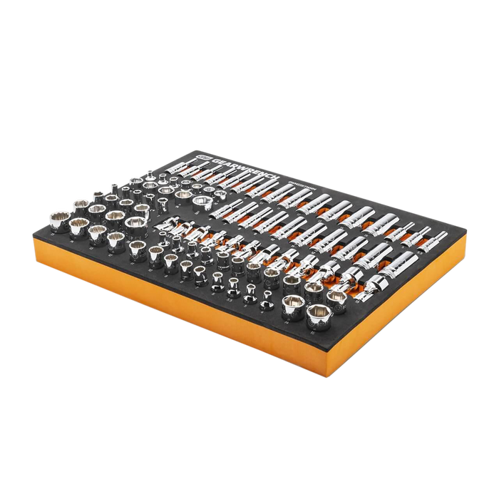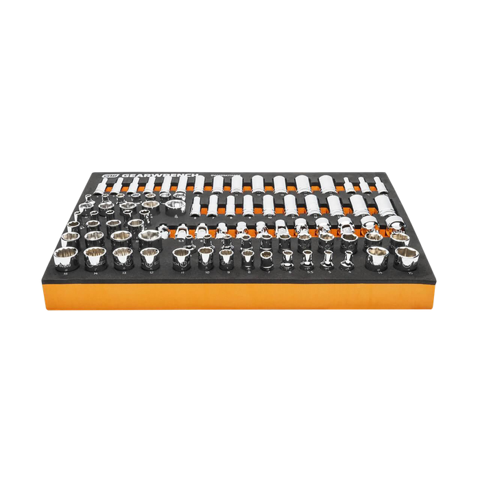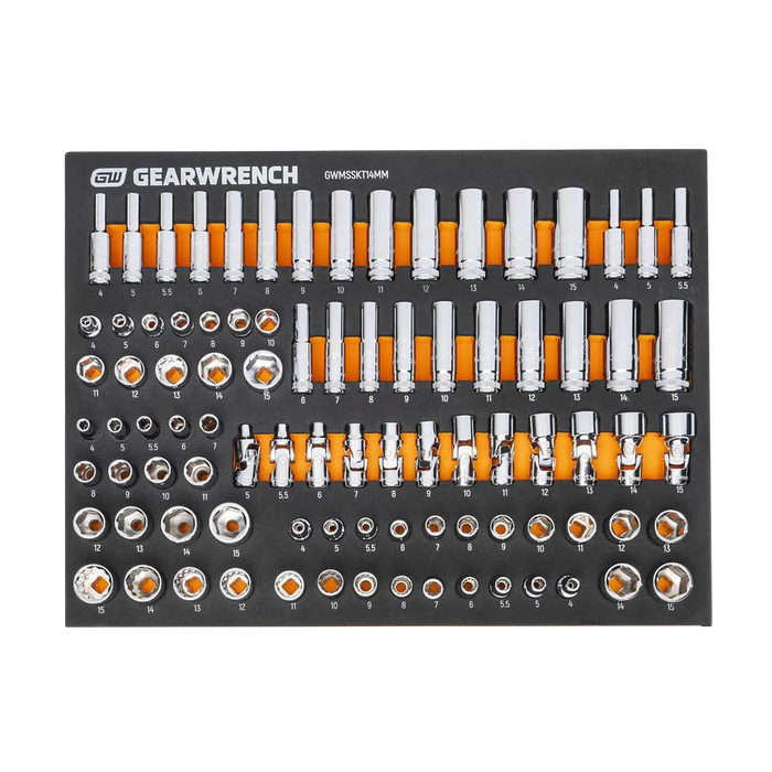 GEARWRENCH mechanics tools have been designed with professional users in mind for better productivity, access, and strength. The 89 piece 1/4” drive master metric socket set in a foam storage tray is one of the wide collection of GEARWRENCH Modular Sets. These chemical and solvent resistant foam trays are designed to fit in a wide range of tool storage systems, including our line of storage products. The foams are in contrasting orange and black with high visibility size markings for easy tool identification. Each of the tools fits in a custom cutout that provides optimal protection, organization, and accessibility.
