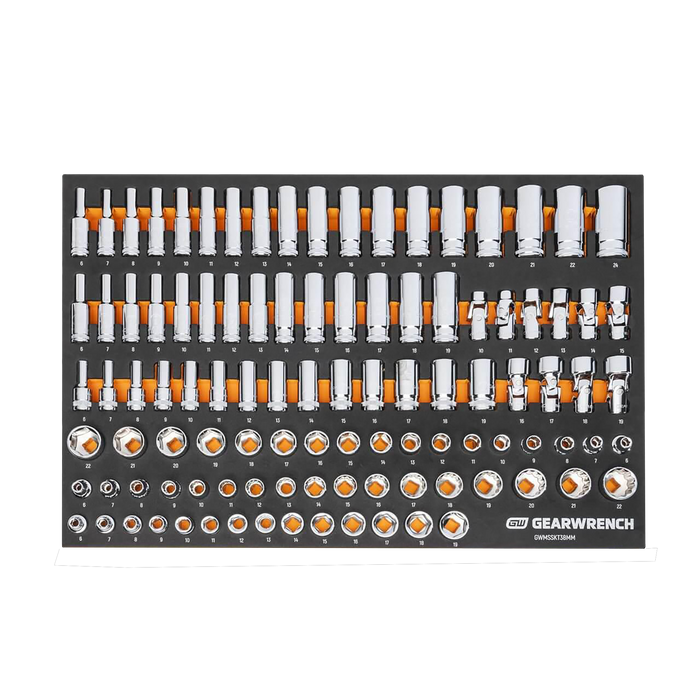 GEARWRENCH mechanics tools have been designed with professional users in mind for better productivity, access, and strength. The 104 piece 3/8” drive master metric socket set in a foam storage tray is one of the wide collection of GEARWRENCH Modular Sets. These chemical and solvent resistant foam trays are designed to fit in a wide range of tool storage systems, including our line of storage products. The foams are in contrasting orange and black with high visibility size markings for easy tool identification. Each of the tools fits in a custom cutout that provides optimal protection, organization, and accessibility.