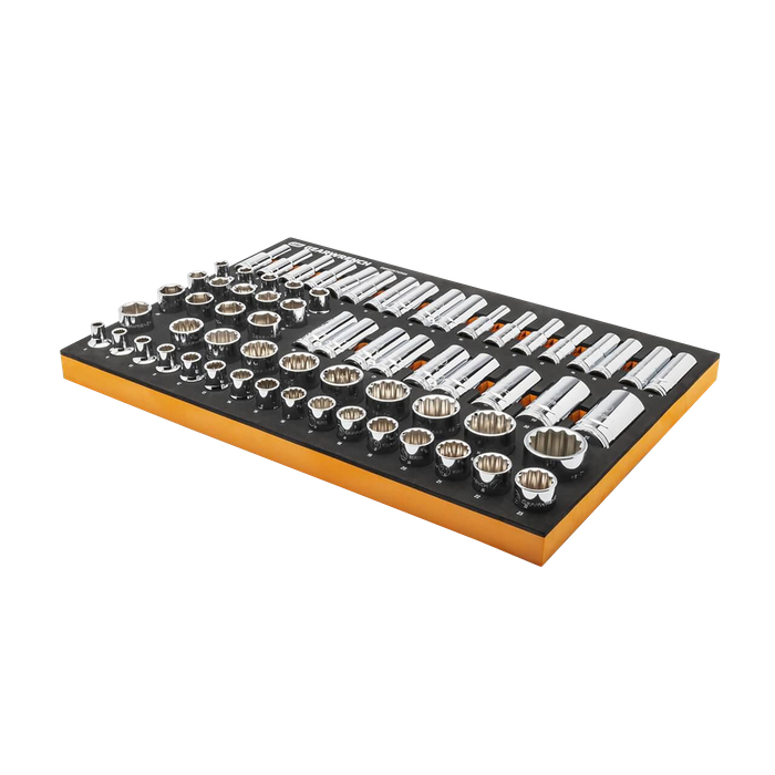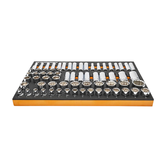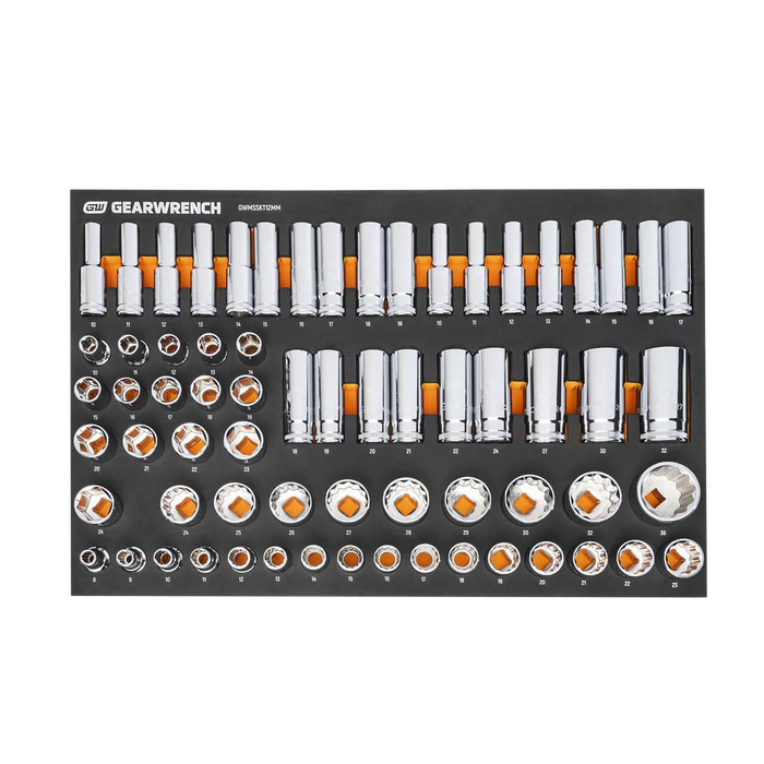 GEARWRENCH mechanics tools have been designed with professional users in mind for better productivity, access, and strength. The 67 piece 1/2” drive master metric socket set in a foam storage tray is one of the wide collection of GEARWRENCH Modular Sets. These chemical and solvent resistant foam trays are designed to fit in a wide range of tool storage systems, including our line of storage products. The foams are in contrasting orange and black with high visibility size markings for easy tool identification. Each of the tools fits in a custom cutout that provides optimal protection, organization, and accessibility