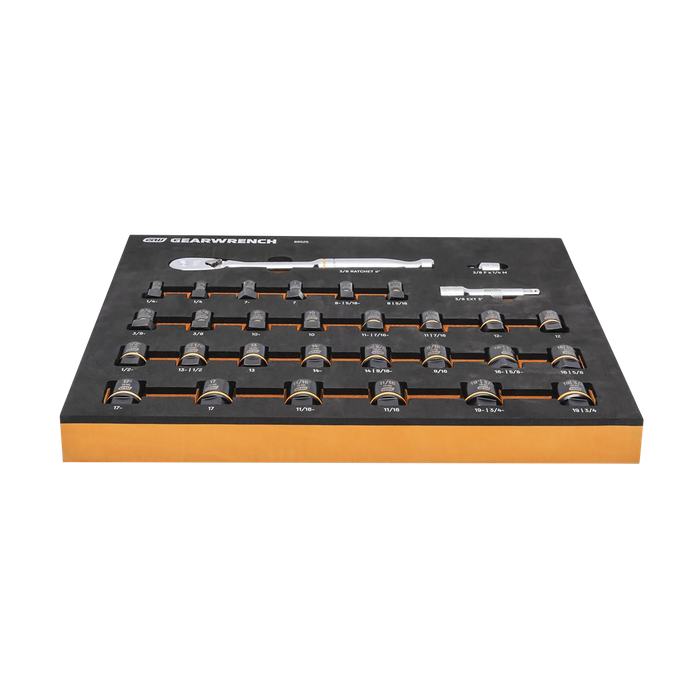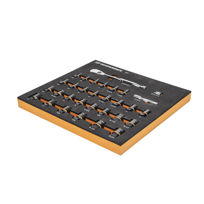 GEARWRENCH mechanics tools have been designed with professional users in mind for better productivity, access, and strength. The 31 piece 90 tooth ratchet and Bolt Biter™ socket set in a foam storage tray is one of the wide collection of GEARWRENCH Modular Sets. These chemical and solvent resistant foam trays are designed to fit in a wide range of tool storage systems, including our line of storage products. The foams are in contrasting orange and black with high visibility size markings for easy tool identification. Each of the tools fits in a custom cutout that provides optimal protection, organization, and accessibility.