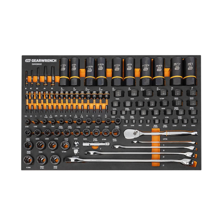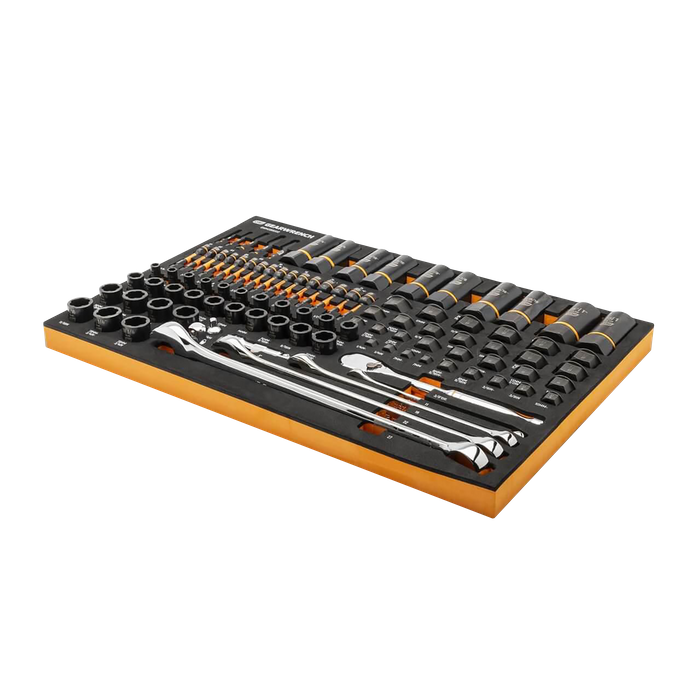 GEARWRENCH mechanics tools have been designed with professional users in mind for better productivity, access, and strength. The 97 piece Bolt Biter™ master set in a foam storage tray is one of the wide collection of GEARWRENCH Modular Sets. These chemical and solvent resistant foam trays are designed to fit in a wide range of tool storage systems, including our line of storage products. The foams are in contrasting orange and black with high visibility size markings for easy tool identification. Each of the tools fits in a custom cutout that provides optimal protection, organization, and accessibility.