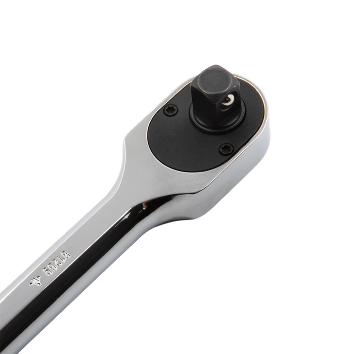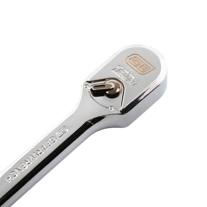 The 81269XP - 3/8" Drive 120XP™ Full Polish Chrome Extra Long Handle Ratchet – the ultimate ratchet for your fastening needs! Equipped with two double-stacked 60-tooth pawls, this ratchet offers an impressive 120 positions and a 3° swing arc, enabling swift turns even in tight spaces. The double-stacked pawls ensure exceptional strength as they engage the 60-tooth gear. Designed with your comfort in mind, the ergonomically contoured handle provides optimal leverage, comfort, and control. This ratchet's compact head design, up to 22% more compact than existing ratchets, allows for better access to those hard-to-reach fasteners. Its enclosed head design guarantees extreme resistance to dirt infiltration, while the highly visible on/off markings on the head allow for quick identification. With a bright, full polish chrome finish, this ratchet not only easily wipes clean but also resists corrosion, ensuring long-lasting durability. Experience unparalleled performance with the 81269XP - 3/8" Drive 120XP™ Full Polish Chrome Extra Long Handle Ratchet.