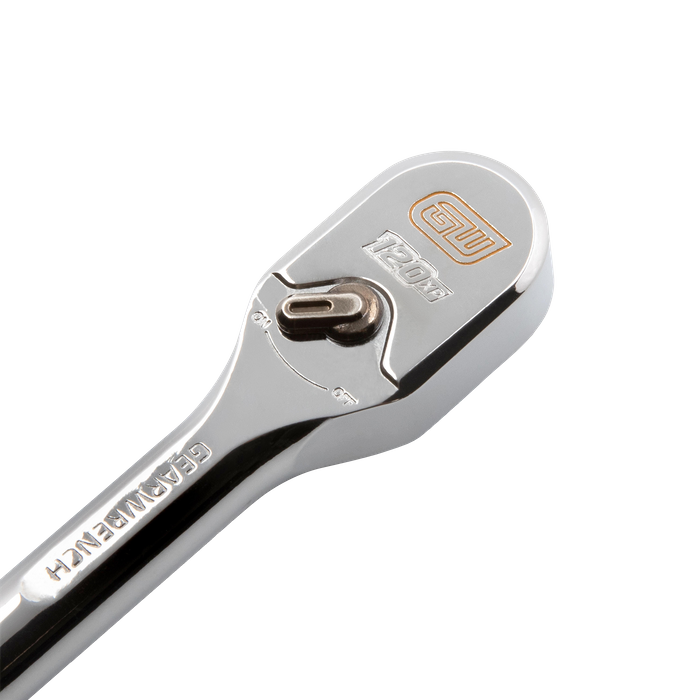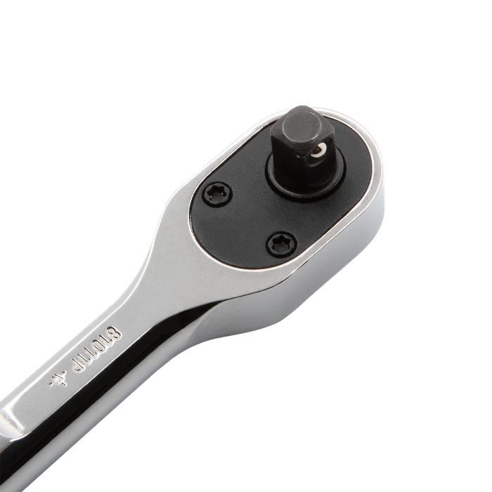 The 81011XP - 1/4" Drive 120XP™ Full Polish Chrome Ratchet – the ultimate ratchet for your fastening needs! Equipped with two double-stacked 60-tooth pawls, this ratchet offers an impressive 120 positions and a 3° swing arc, enabling swift turns even in tight spaces. The double-stacked pawls ensure exceptional strength as they engage the 60-tooth gear. Designed with your comfort in mind, the ergonomically contoured handle provides optimal leverage, comfort, and control. This ratchet's compact head design, up to 22% more compact than existing ratchets, allows for better access to those hard-to-reach fasteners. Its enclosed head design guarantees extreme resistance to dirt infiltration, while the highly visible on/off markings on the head allow for quick identification. With a bright, full polish chrome finish, this ratchet not only easily wipes clean but also resists corrosion, ensuring long-lasting durability. Experience unparalleled performance with the 81011XP - 1/4" Drive 120XP Full Polish Chrome Ratchet.