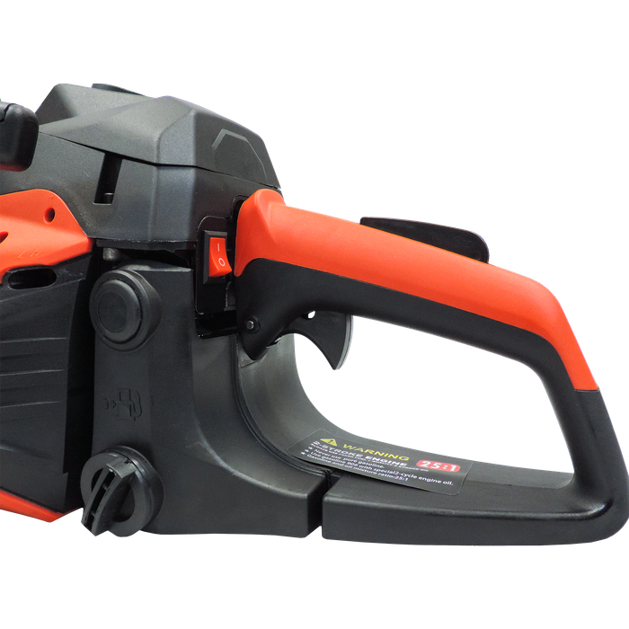 The chainsaw features an automatic chain brake to stop the chain instantly in case of kickback, plus a rear handle trigger with safety switch for controlled operation. The carburettor anti-freeze system ensures reliable performance even in colder weather, while the automatic chain oiling system keeps the bar and chain properly lubricated. A built-in sight glass oil window makes it easy to monitor levels, reducing downtime.