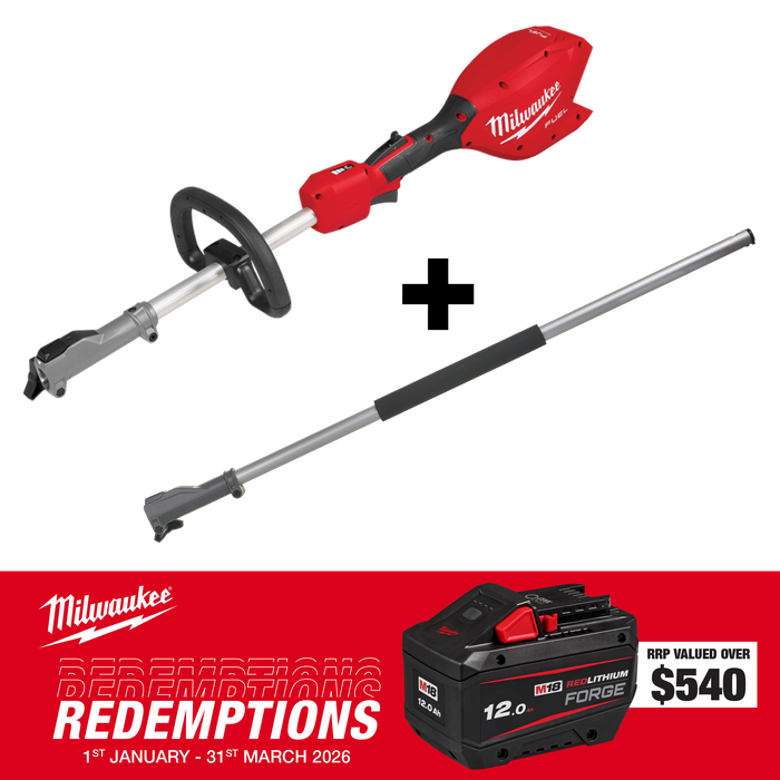 Our M18 FUEL® Attachment Extension is powered by the M18 FUEL® Outdoor Power Head and is compatible with our M18 FUEL® 10" Pole Saw and Hedge Trimmer Attachments. The extension attachment gives you 102cm of additional length for applications requiring further reach. The attachment includes a padded grip giving you increased comfort. The extension's QUIK-LOK™ Coupler has a positive locking mechanism and alignment guide allowing you to quickly make attachment changes. The QUIK-LOK™ Attachments feature protected drive shafts for increased durability against drops and storage elements.