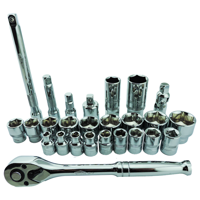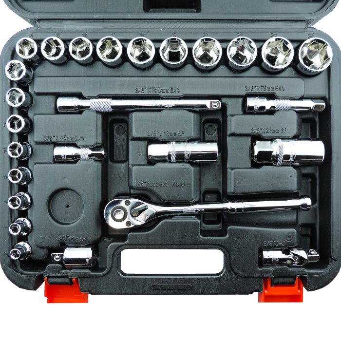 This is a great socket set for those larger jobs around the home or workshop. The 3/8" Dr sockets range from 6mm to 24mm. This set also comes with a few other accessories as well.