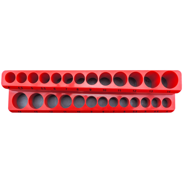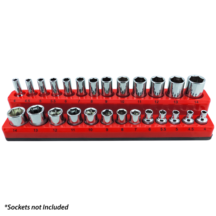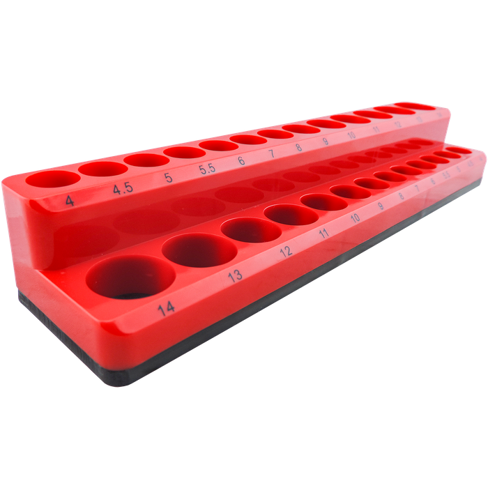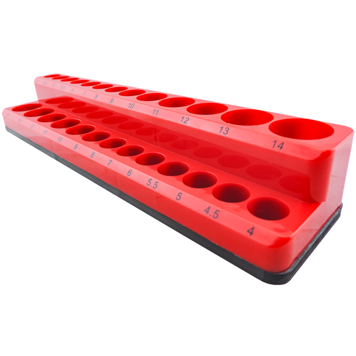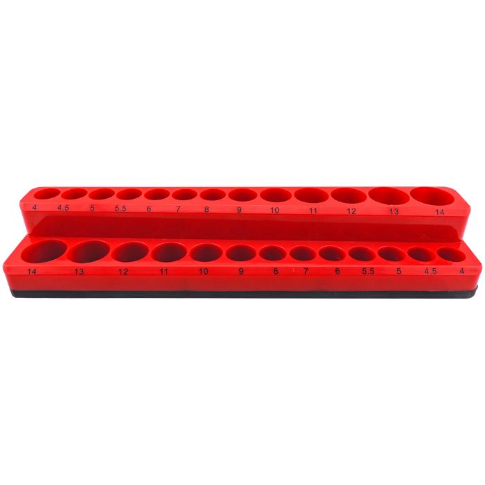 Designed for professional tradespeople and mechanics, this heavy-duty magnetic socket organiser holds 26 sockets, 13 standard and 13 deep sizes ranging from 4mm to 14mm, so every tool has its place. Made from high-impact ABS plastic, it's built to withstand daily use in busy workshops, garages, or service vehicles.