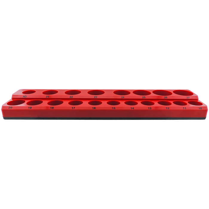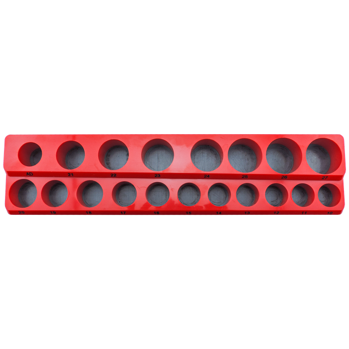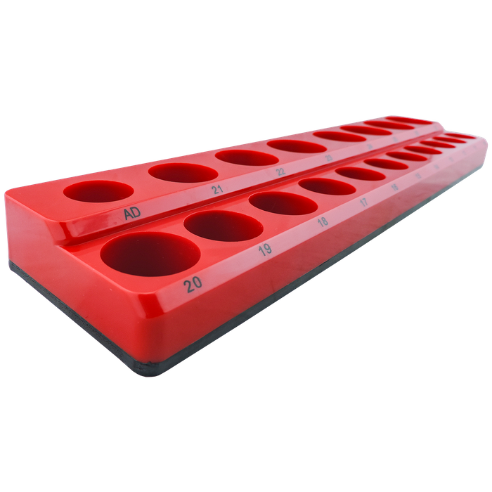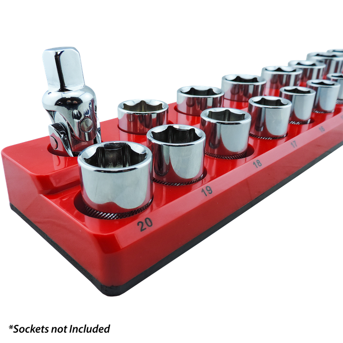 The ToolShed Magnetic Socket Holder 1/2 Inch is a heavy-duty socket organiser designed for tradespeople, mechanics, and DIYers who want their tools secure, visible, and easy to access. It holds 19 sockets in total, both deep and standard sizes from 10mm to 27mm, including an adaptor slot, keeping your most-used tools neatly arranged and ready for work. Made from high-impact ABS plastic, it delivers long-lasting durability and resistance to wear, making it perfect for demanding workshops, garages, or mobile tool setups.