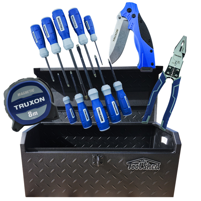 All items are housed in a ToolShed Steel Tool Box, (TSSTB1) built tough with a spacious interior, solid top lid, powder-coated finish, lockable latch, and strong carry handles.