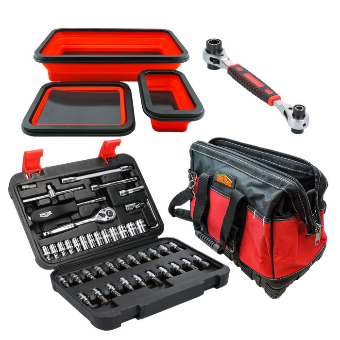 The ToolShed Automotive Starter Gift Bundle brings together four practical essentials, our 46pc 1/4" Drive Socket Set, Silicone Magnetic Parts Trays, 8-in-1 Multi Ratchet Wrench, and a rugged ToolShed Tool Bag, valued at $230, making it the ideal gift for new motorists, DIY mechanics, or anyone wanting to build a reliable starter toolkit.