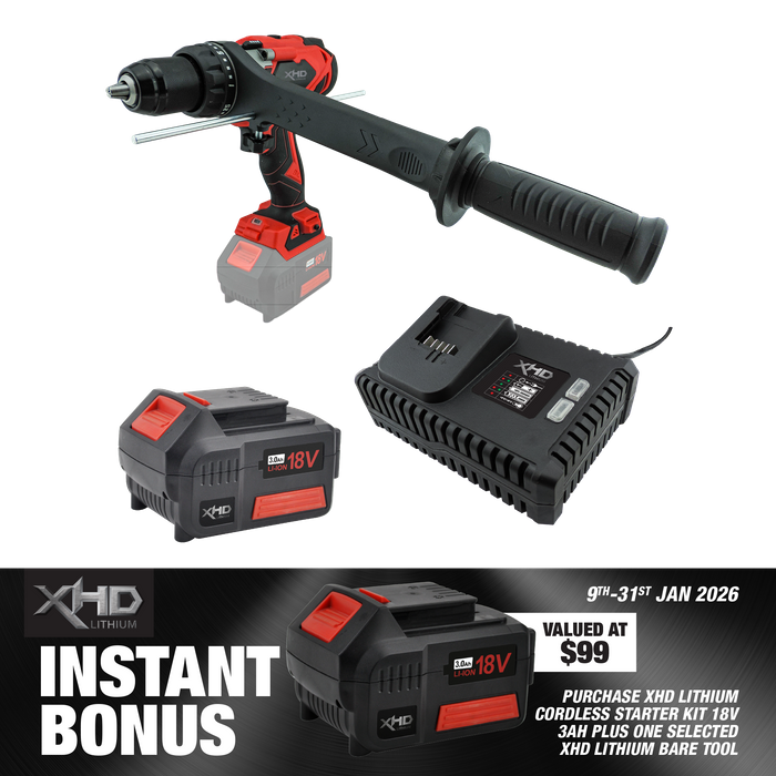 - XHD Lithium Starter Kit 18V 3Ah with Heavy Duty Hammer Drill 150Nm 18V