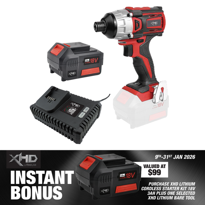 - XHD Lithium Starter Kit 18V 3Ah with Impact Driver 180Nm 18V