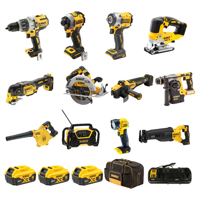 Supplied with 3 x DCB184 5Ah Batteries, DCB132 4A Dual Port Charger and DeWalt Soft Tool Bag.