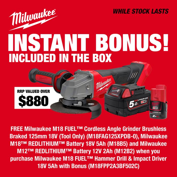 Milwaukee M18 FUEL Hammer Drill & Impact Driver 18V 5Ah with Bonus M18 Grinder 5Ah M18 Battery and M12 2Ah Battery