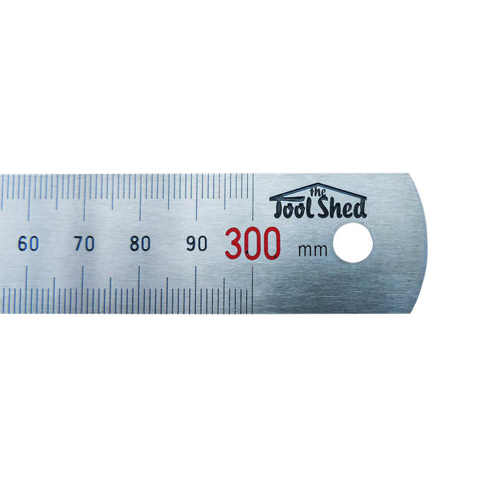 The ToolShed Stainless Steel Ruler 300mm is a top-tier measuring tool, renowned for its exceptional accuracy and durability. The ruler features both metric measurements on one side and imperial measurements on the other, with metric graduations at 1mm intervals and imperial graduations at 1/64in, 1/32in, and 1/16in intervals. Its laser-etched markings ensure longevity, preventing fading or scratching. For easy readability, each 100mm increment is highlighted in bold red. Constructed from hardened 304 stainless steel, this ruler is built to resist corrosion and impact, ensuring long-lasting performance. It also comes in a reusable protective plastic sheath and includes a hook hole for convenient hanging and storage.